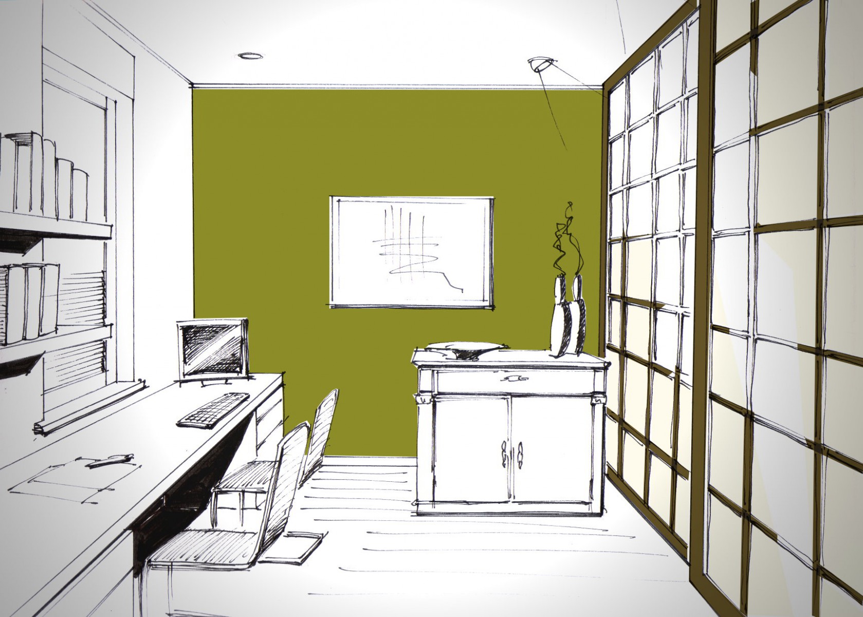 - Arbeitszimmer mit Schiebewand vor großer Staufläche